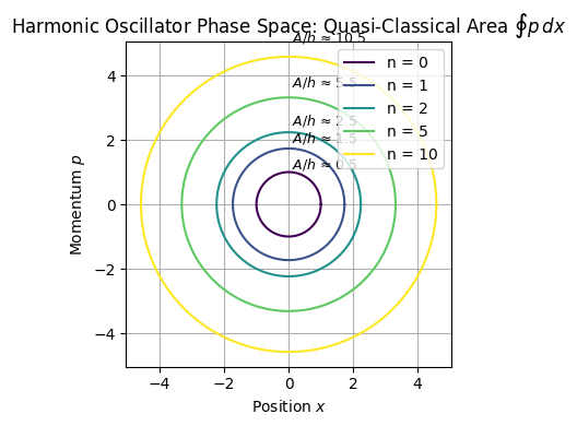 ax.set_title("Harmonic Oscillator Phase Space: Quasi-Classical Area $\oint p \\, dx$")
