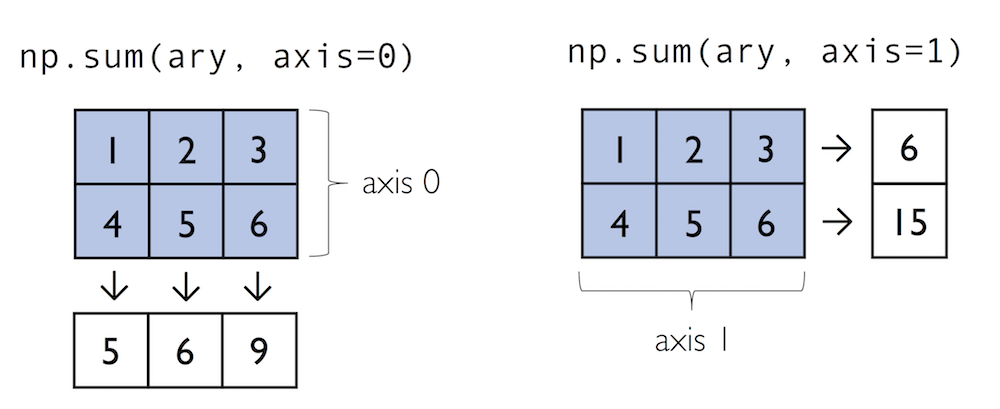 np.sum(x,axis=1)print(np.sum(x)) # Compute sum of all elements; prints "10"