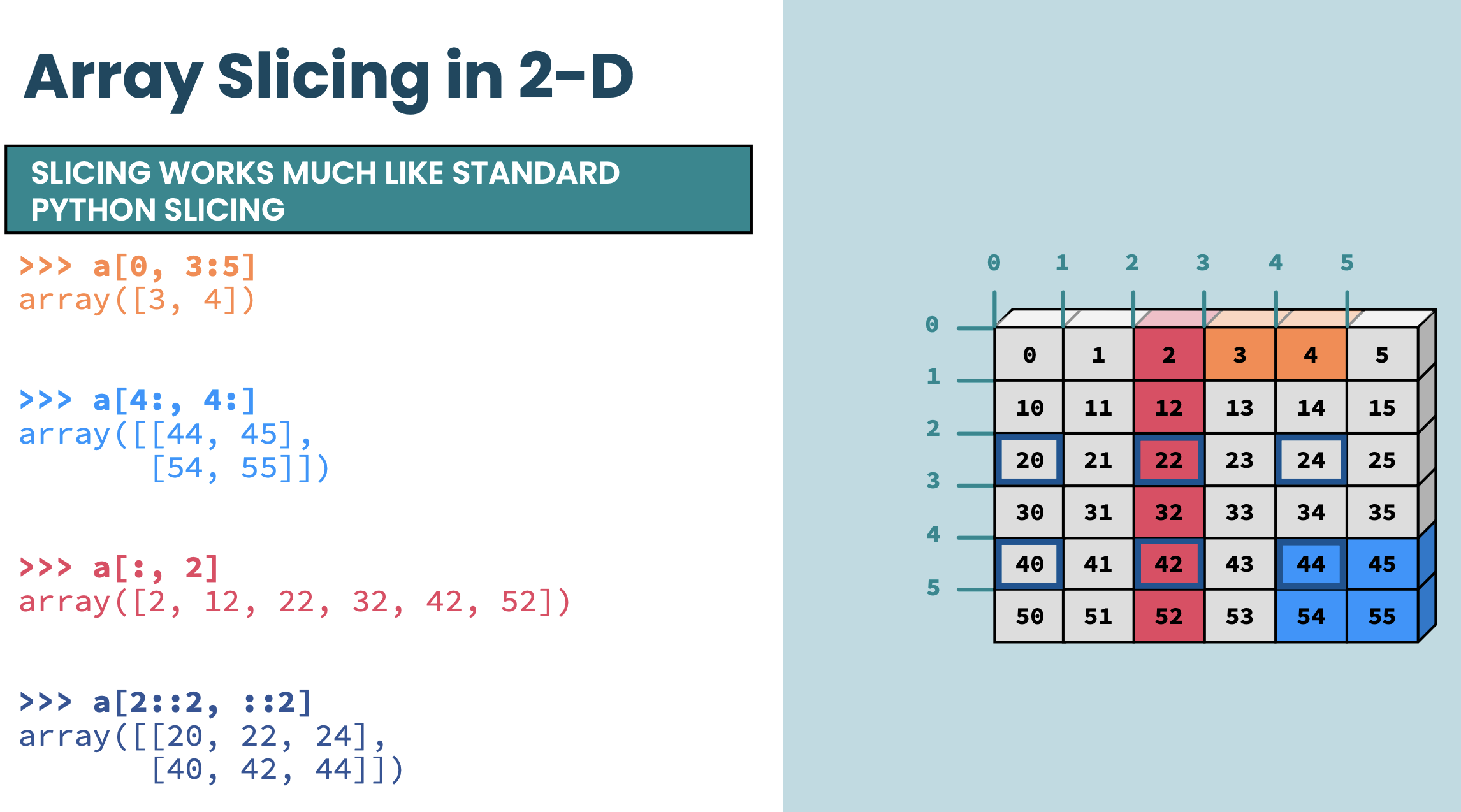 Slicing: Similar to Python lists, numpy arrays can be sliced. Since arrays may be multidimensional, you must specify a slice for each dimension of the array: