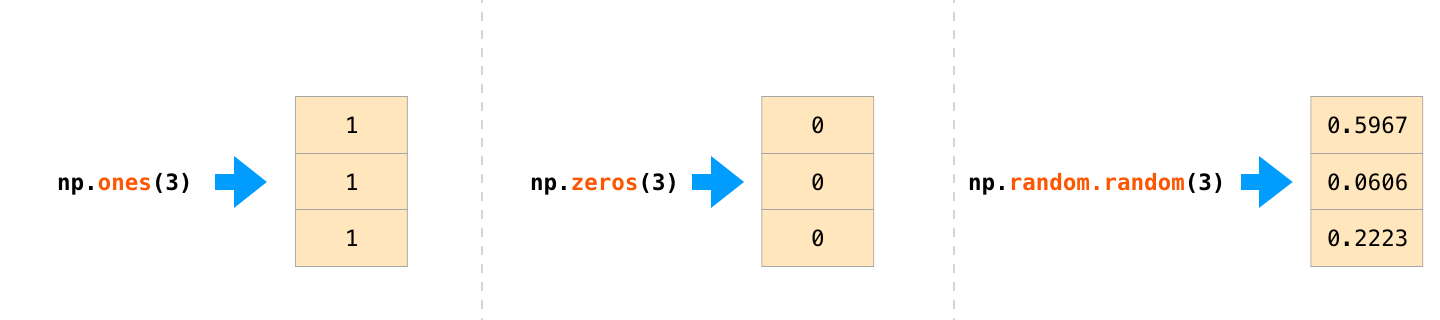 Creating arrays of ones or zeros can also be useful as placeholder arrays, in cases where we do not want to use the initial values for computations but want to fill it with other values right away.